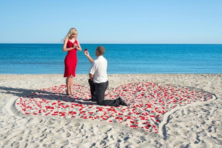 Benimle Evlenirmisin Evlilik teklifi Deniz kumlu sahilinde sevgi dolu çift.Gül yapraklarının kalbinde kırmızı elbiseli güzel sarışın kadınına altın yüzükle teklifte bulunan bir adam.